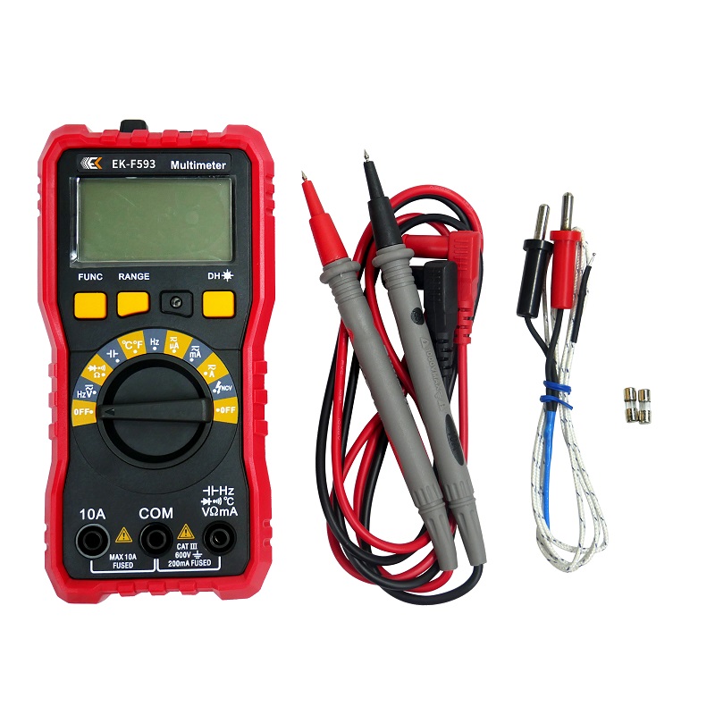 随机附件 | 仪表:1件; 表笔:1付;温度探头:1条;电池 LR03:2节;200mA小保险管:1个;10A保险管:1个 |